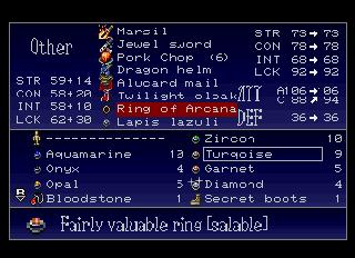 | Hello! First and foremost, allow me to say thank you for translating this game. It was a wonderful experience for me to play through the Saturn version of this game for the first time, and I wouldn't have been able to enjoy it as much without your efforts. Since you've asked for some items that needed fixing, here are the ones I've noticed through my playthrough. The item Turquoise seems to be misspelled as "Turqoise." Also, the item Green Tea wasn't changed back to Sake, which I found odd, since Barley Tea and Grape Juice were changed back to Beer and Wine, respectively. It honestly doesn't matter either way, but I felt like pointing it out. Colosseum is mistyped as "Colloseum" in the file select screen. Reverse Colosseum is also typed as "Reverse Colloseum" too. And something that's really nitpicky, but Cursed Prison and Soul Prison are translated as "Cursed Jail" and "Soul Jail" in the file select screen. I know I might've come off as nitpicky and ungrateful, but I assure you that's not the case at all! Thanks so much for your hard work! | |||