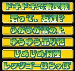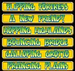 | I messaged cafe-alpha a few days ago, but no response so far. Generally, it's fine, all but one stage names follow a simple formula ("Hopping Village", "Rumbling Dungeon", "Swaying Bridge", "Bouncing Clouds", "Rocking Ninja Shop"), and the rest are just load/save messages I'll probably need to test on real hardware to know what each of them does exactly. All in all, this seems like a super simple game to hack art assets into, and cafe-alpha did all the hard translation work. Edit: How does this sound for level names? (last to first) | |||