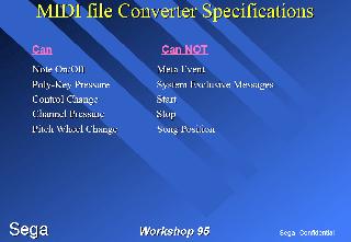 Thanks for the info, I forgot about that powerpoint, it's quite useful! I have the same problem as you do, but I downloaded a MIDI editor for Mac and used it to read Midi files and save them with it, which allows me to get the files on the list, but I get errors when I try to convert to the Sega format. Maybe I'll have to find a way to get the programs Sega suggested, but since we don't have all the needed hardware maybe it can't be done. | ||||