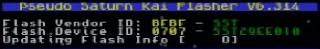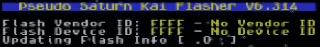 If you own an ODE (Rhea/Phoebe, Fenrir etc) then you can simply run the flasher utility from there and try again. If you don't have an ODE and your Saturn isn't equipped with a modchip to read CD-Rs, you'll have load the flasher utility via the disc swap trick. When running the flasher utility, if the Vendor ID and Device ID look like this: Then please pull the cartridge up gradually until it looks like this: | ||||