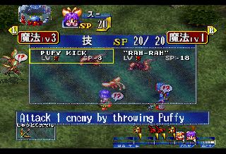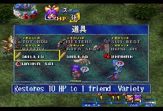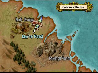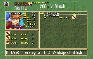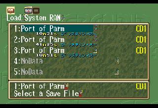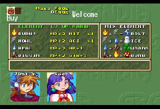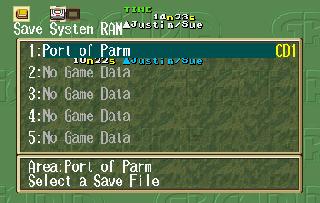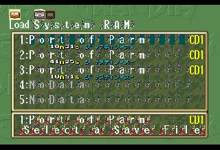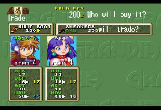 | EDIT: I realized I forgot to post some battle screenshots: So I did some more digging and I have at least found what the game uses to know which MDT file to load when you change areas. At offset 0x06029A00 there's a table that lists all the files on the CD, with a value for what sector it's at, and how many bytes it is. The game references this when it wants to load a new file. How it knows which file to get out of this list though I don't know yet. However, I have been able to play around and have the game load different areas for me by changing the values for one MDT file to be that of another. So by doing this I was able to go from the Port of Parm to New Parm and test out the magic shop screen: Unfortunately this screen got modified in the English PS1 version, so some of those translations either wont fit or don't make sense, so I've had to improvise a bit here. I also tested out the buy screen and found I missed a word in the trade screen: Finally, just for fun I took Sue on a date to the Pirate Island. The game went a bit bonkers, I can only imagine because characters that should be in the party weren't there, and characters that shouldn't be in the party were there. The game eventually crashed when invisible Feena tried to speak after Justin spoke on behalf of a mermaid: | |||
