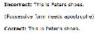 The page you linked does not clarify the possessive apostrophe rule for the pronoun "it". In the case of nouns like dog, or sword, or Justin, we get things like "the dog's collar is red", "the sword's edge is sharp", or "Justin's hat is cool". I think you might be applying that rule to where it should not. Possessive pronouns do not include apostrophes, which applies to "it", "her", "their"; instead, we get "its", "hers" and "theirs" respectively. On the same website, there is another article that goes into a bit more depth regarding possessive pronouns: Source: 10 Apostrophe Rules Violations... In the case of definite pronouns like "it", the apostrophe is not used. For indefinite pronouns like "one", or "anyone", the apostrophe is used. A bit of an aside, but I also noticed an error on the page you linked. Typically, since "shoes" is plural, we use a corresponding plural pronoun like "these" instead. The correct sentence would be "these are Peter's shoes". For future reference, I recommend using a different website to brush up on grammar. I can't speak for the whole website, but the page I've linked below is more concise and clear. |