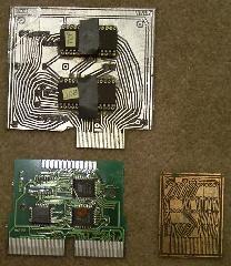 Longer than it would have taken someone more experienced than me. I'd say two weeks (including some days pause) for ordering everything needed, making 3 layout revisions (two can be seen on one of the pictures) and etching two pcbs on both sides. I also had to create a PC tool to convert the binary to two EPROM binaries, as the address and data pins are not connected one-on-one, instead I mixed pins such that the layout works best. However, the most time consuming part is to remove the paper from the copper, after I applied both together with a flat iron. The laser printer color is like glue between them. In the first place, I gathered information about the cart port, the BIOS and related technical stuff, then I looked around to choose the right ICs and the cheapest shops (This took one or two weeks, in addition). The prototype cart is also "completely" tinned.