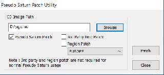 Save Game Copier needs to be patched with the Pseudo Saturn patcher utility for saves in "CD File System" to be available when an SGC CD-R is loaded via Pseudo Saturn Kai (don't know why, it just does). Utility is in tools\cdpatch.exe in the Pseudo Saturn Kai archive and is also available separately here..., use these settings to patch:  Save importing works fine in Mednafen v1.32.0 but, after importing any save file from the CD file system on real hardware, the Jo Engine error handler throws a pair of errors for each file in the SATSAVES folder : - In cdReadBUPHeader() Failed to read bup header