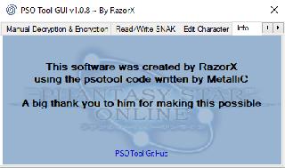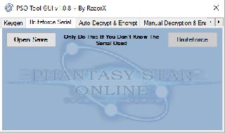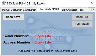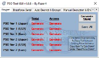 | | PSO Tool GUI ~ By RazorX This software will allow you to do the following: - Generate A Random Serial And Access Number For Phantasy Star Online